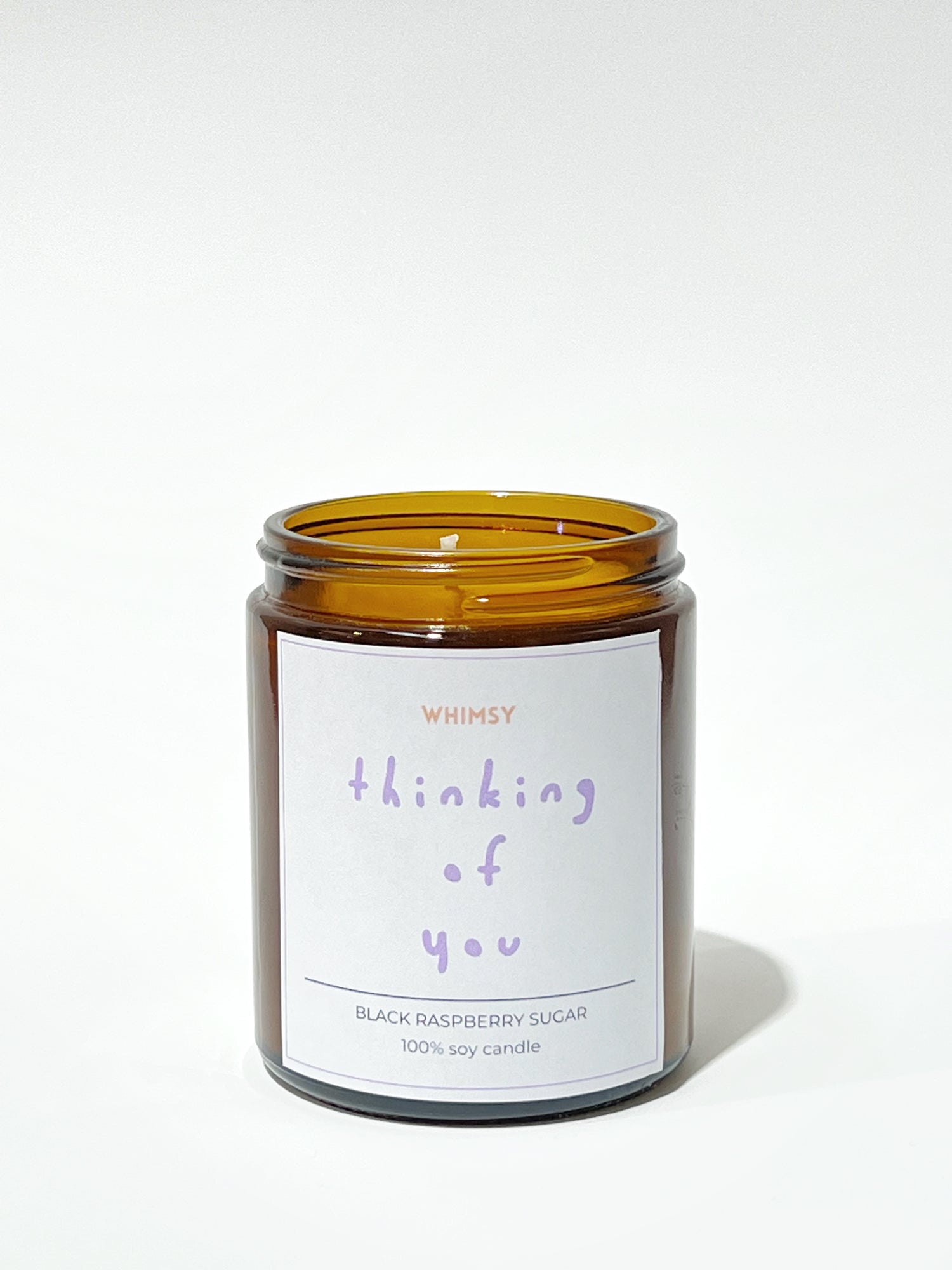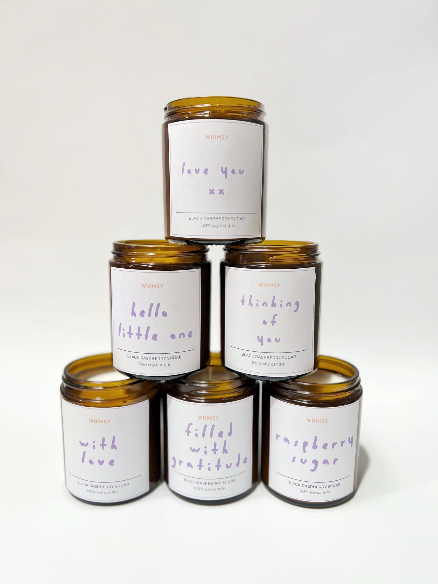 Hand poured soy wax candle in small amber glass jar. Scented black raspberry sugar and labelled differently to match your occasion. Add this to your existing order to upgrade your gift!